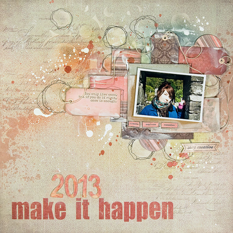 Creating this LO was very intuitive - scraps of paper, mixedmedia, creative "mess" and important message for this year. I wish for myself (and for you also!) many creative and happy moments