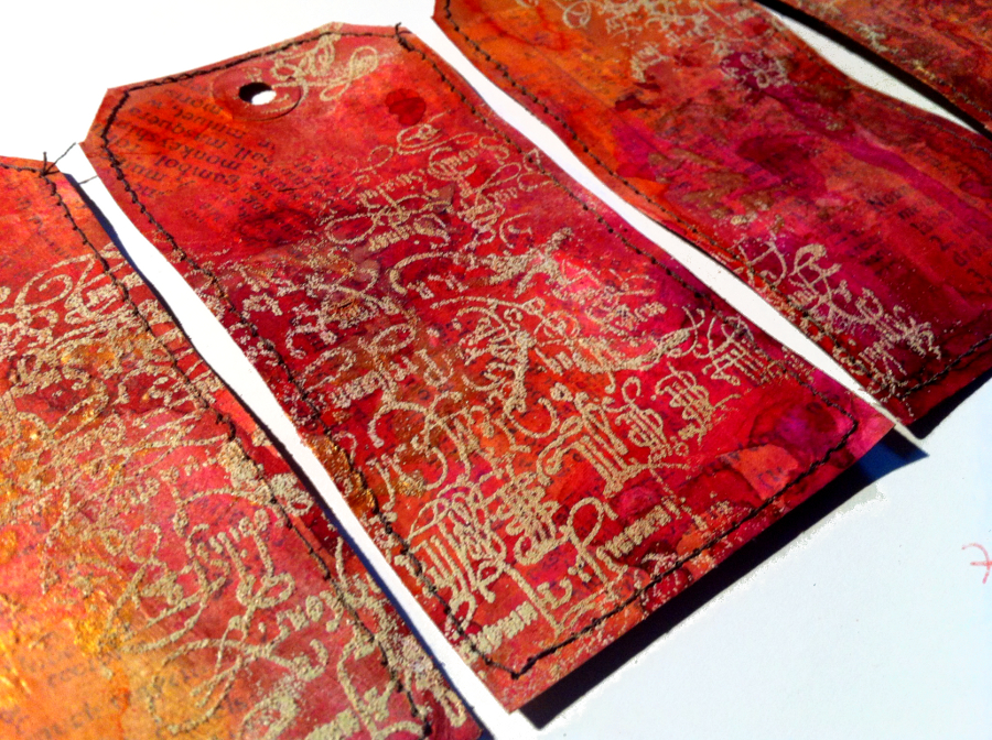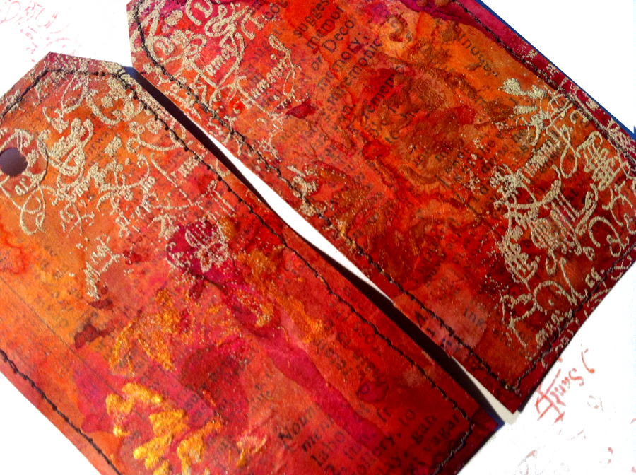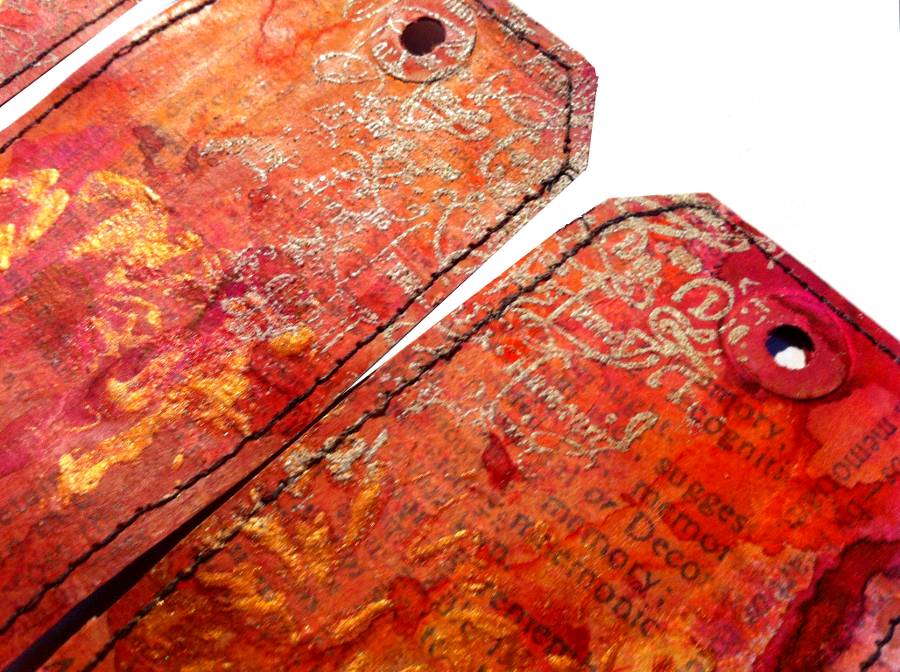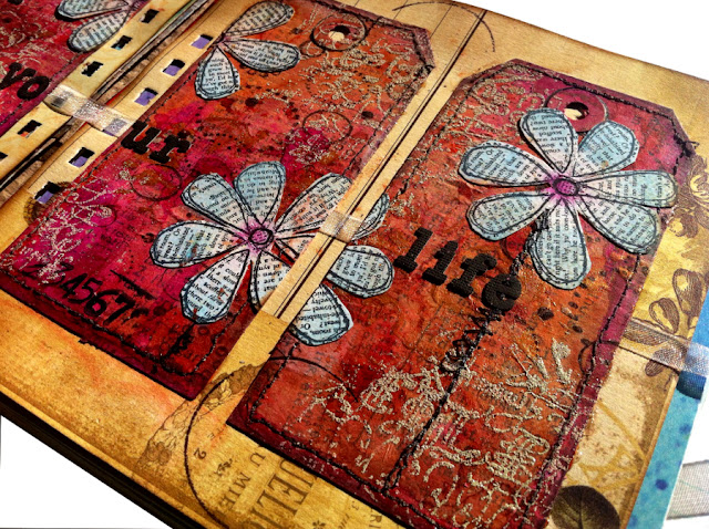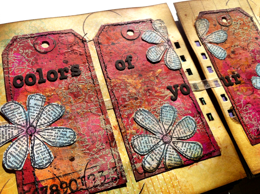 This art-journal page is made from 4 tags where on colored background I embossed the
