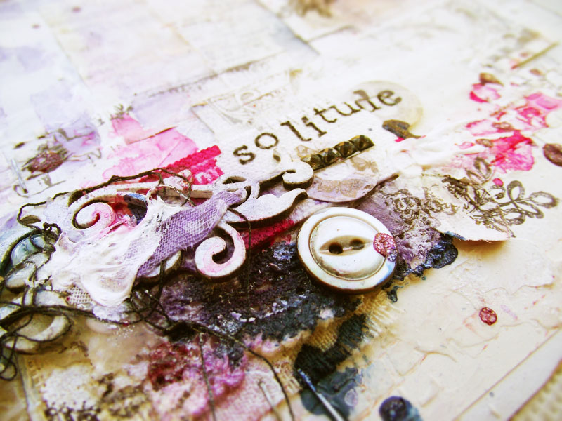 Solitude really scares me but I want to face my fears and get used to them because I know everything can happen. What I used to create texture is gesso, modeling paste and gel medium. I did some stamping, stenciling and doodling but the most important was layering papers, paints and embellishments.