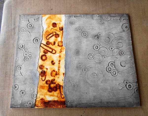 the last layer of modeling paste was halfway dry, I made imprints using