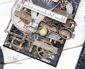 My idea started from pictures of hot air balloons. I remembered that I have a sheet of paper from Cartographer collection by Prima marketing, I cut hot air balloons, took some metal embellishments and sticker quot from 7Dots studio, that are perfectly fit for every project and made and ATC series.