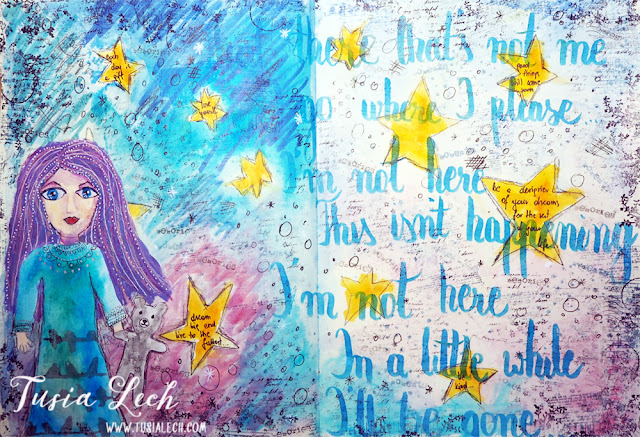 I have added some stamping and handwriting. In my art-journal pages you will always find deeper meaning and my own emotions.