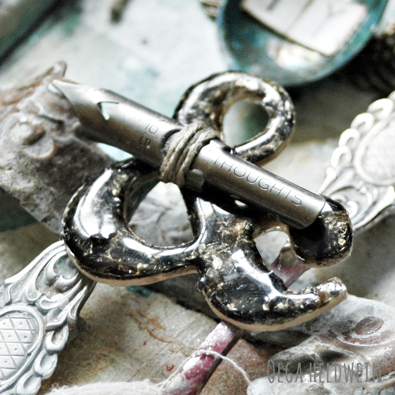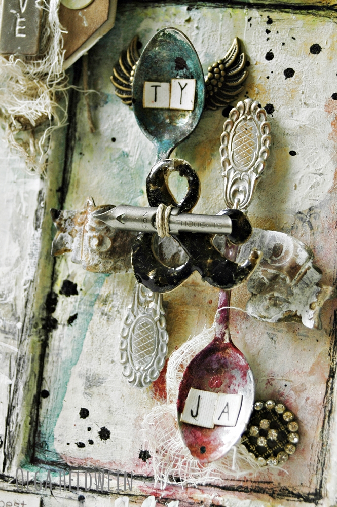 Tło jest wykończone farbkami H2O ponieważ zmieszały się z gesso straciły część połysku ale nadal cudnie się mienia w świetle, natomiast łyżeczki za pomocą tuszy alkoholowych.znaczek & jest wyklejony płatkami miki przez co wygląda jak odlany z ciemnego metalu niesamowity efekt powstał po zatopieniu płatków w utee.