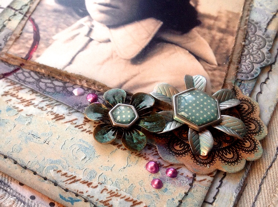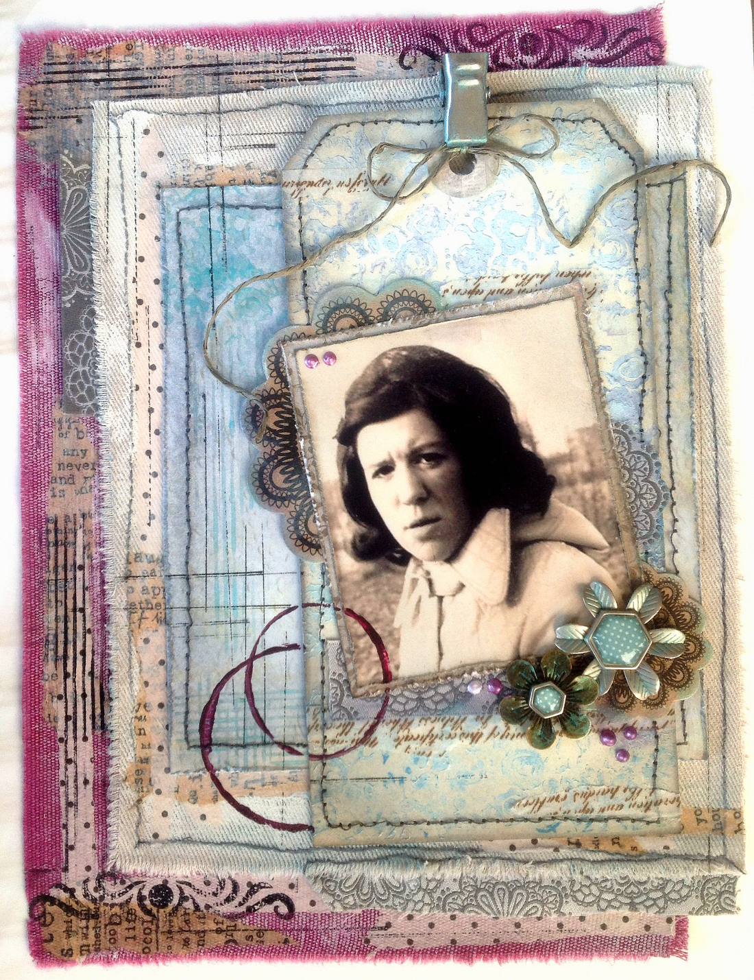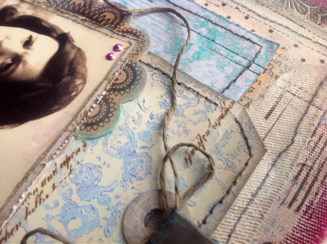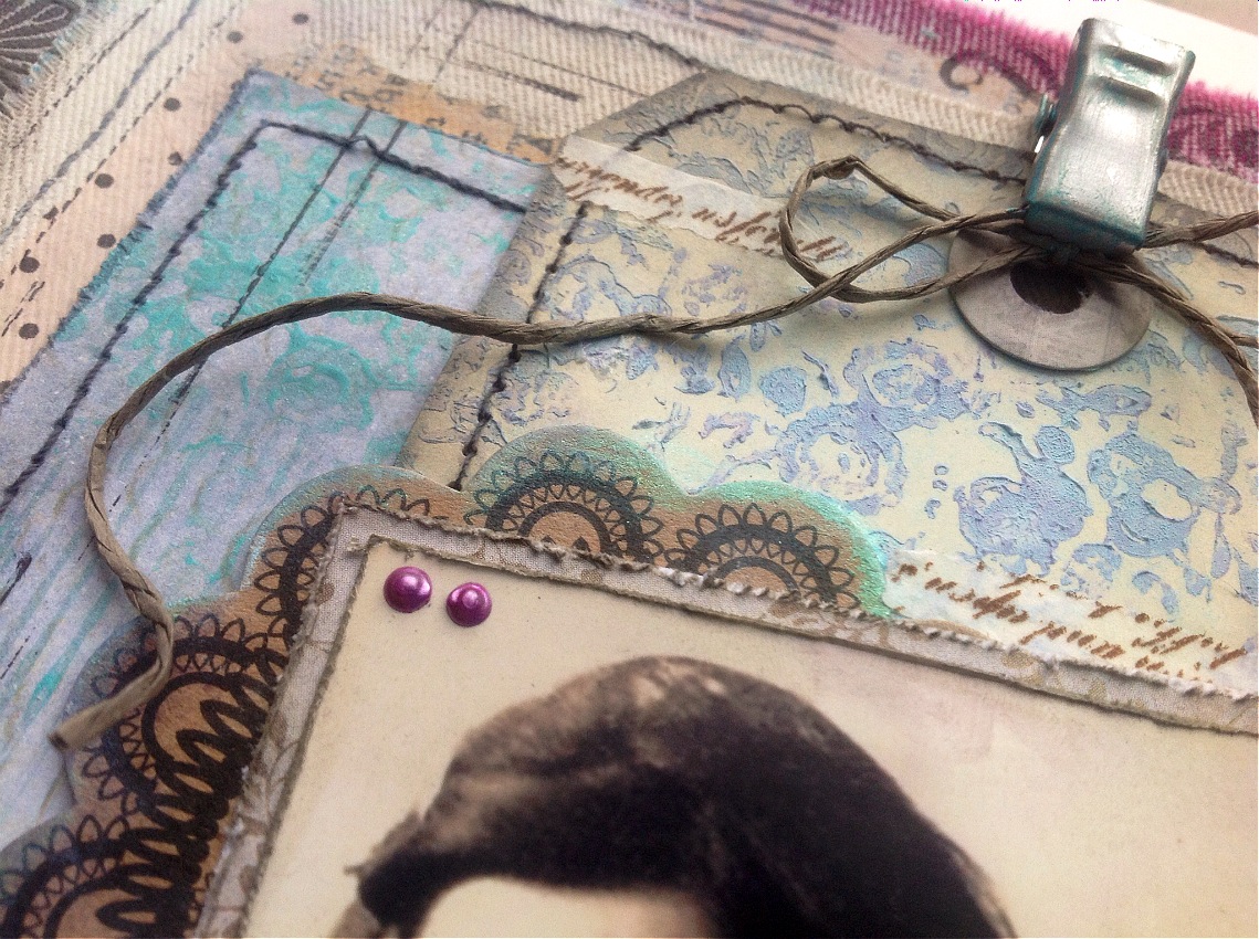 I also used PanPastel in grey colour to distress a little bit the edges of fabrics and tag with photo. The background of tag is stamped gesso mixed with Distress Ink. This technique was presented in very friendly way by Anai from our DT few months ago on her blog. I added structural pasta to this gesso mixture to create more convex texture. I hope that it’s visible on photos.