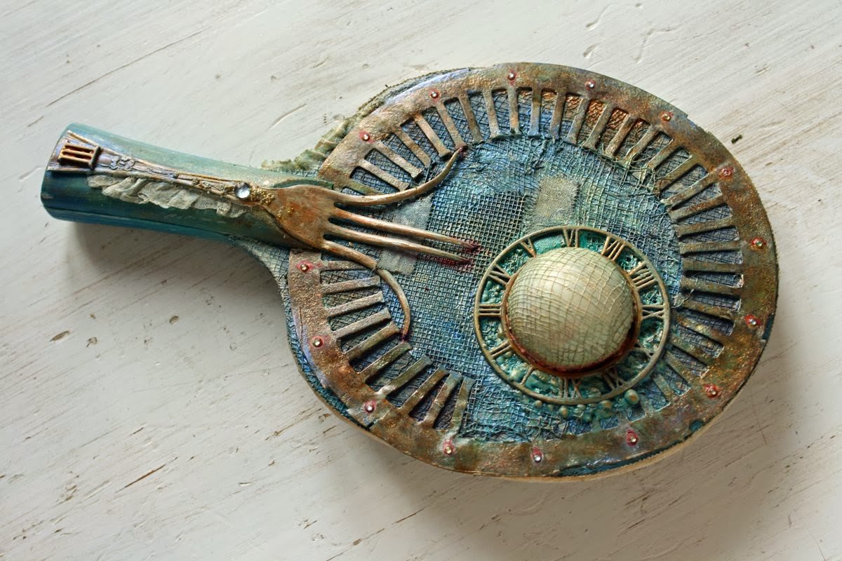 Użyłam papieru z kolekcji 9th Wave oraz papierowych serwetek. Stemplowałam, zrobiłam embossing, poszła w ruch pasta strukturalna. Wszystkie kolory powstały przy użyciu tuszy Distress i Distress Stain. Ozdoby to Mechanicals i inne metalowe dodatki oraz drut, który ostatnio pojawia się w wielu moich pracach.
